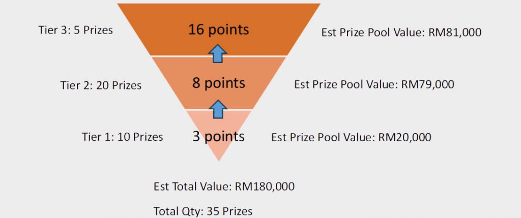 - Upon acquiring a minimum of 3 points, participants are eligible for 1 entry at Tier 1 lucky draw. Upon accumulating an additional 5 points (total 8 points), participants are eligible for 1 entry at Tier 2 lucky draw. Upon accumulating a further 8 points (total 16 points), participants are eligible for 1 entry at Tier 3 lucky draw.