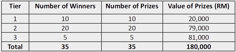 - Each winner is only entitled to receive oneprize from each tier. Example: If the participant has 2 entries at tier 1, and both entries were selected, he/she can only choose 1 prize. The remaining prize will be awarded to the next randomly selected winner.