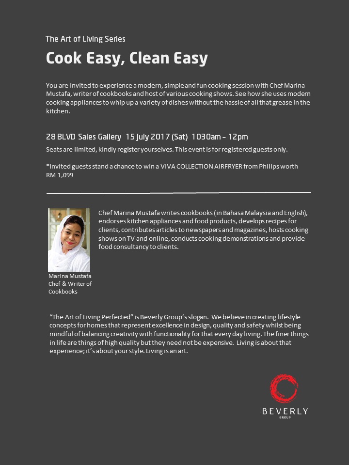 Cook Easy, Clean Easy The Art of Living Series brought to you by Beverly Group. A modern, simple and fun cooking session by Chef Marina Mustafa, writer of cookbooks and host of various cooking shows. in News & Activities Posted by Sandra Low